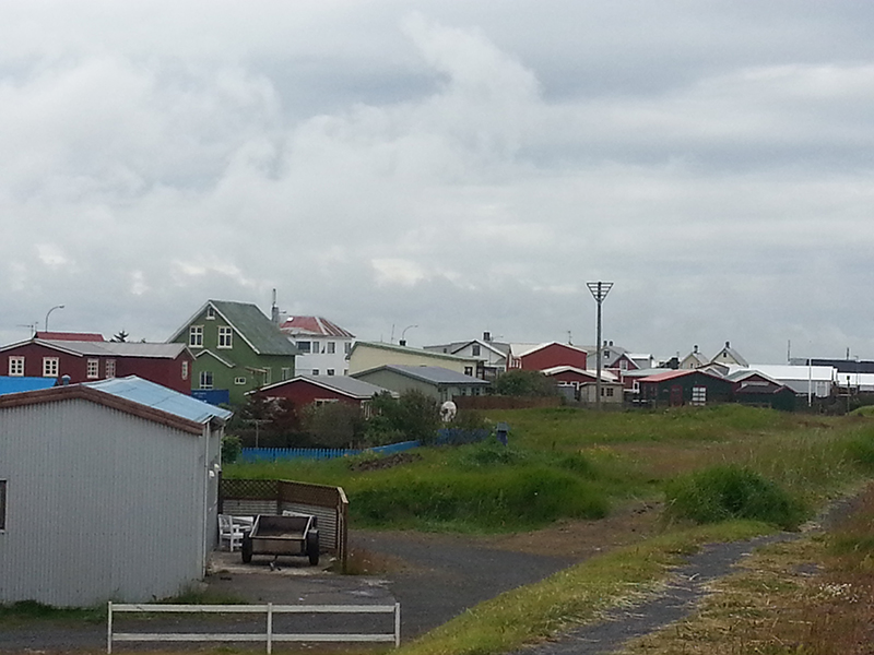 Der Bus fuhr uns über die Ortschaft Selfoss zum alten Handelsort Eyrarbakki. Er war wegen seiner Nähe zum alten Bischofssitz Skálholt jahrhundertelang einer der wichtigsten Hafen- und Handelsorte Islands, heißt es, und hat eine bewegte Geschichte. Wir sahen uns im Ort um und wanderten dann an der Mündung des Gletscherflusses Ölfusá. Stockfisch